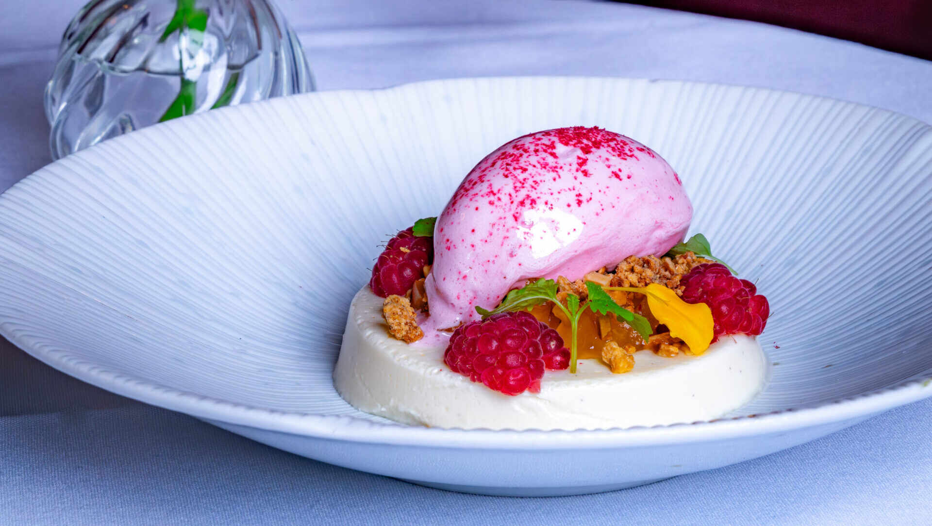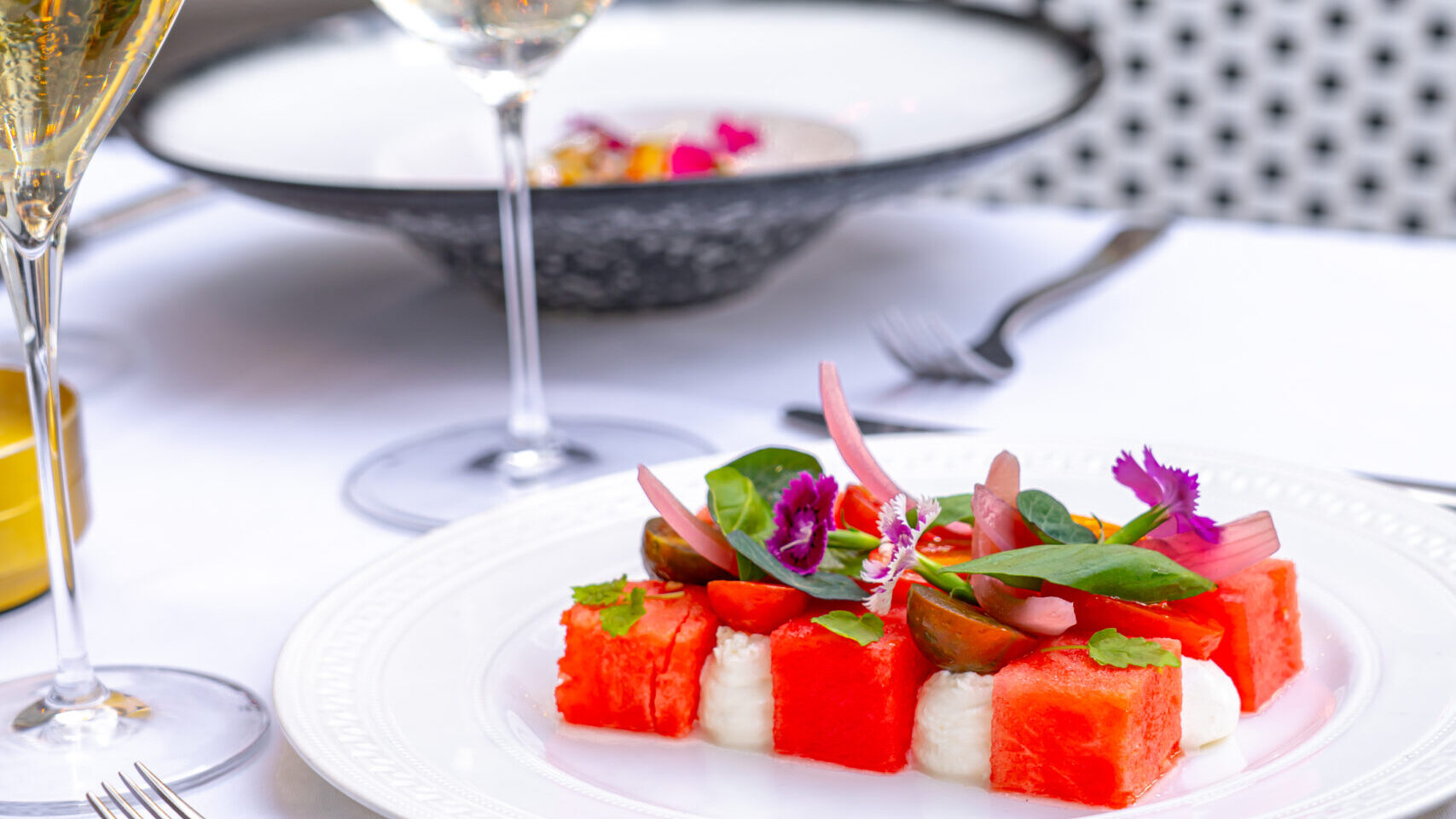 The venue features plush blue velvet seating, red velvet VIP booths, and an alfresco Veuve Clicquot Champagne Garden with water views.